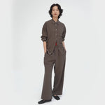 It features a relaxed dropped shoulder, immaculate straight collar, and unique button placements. This shirt effortlessly merges utility with elegance. For a modern twist, button up the back for a tailored silhouette or fasten the sides for an asymmetrical placket that adds visual intrigue.