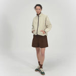 The vest has a mock neckline, close-ended zipper, and contrast elastic binding. An elastic cord and stopper at the hem ensure an adjustable fit. The raglan-style sleeves feature elastic cuffs and snap buttons for a fuss-free transformation.
