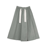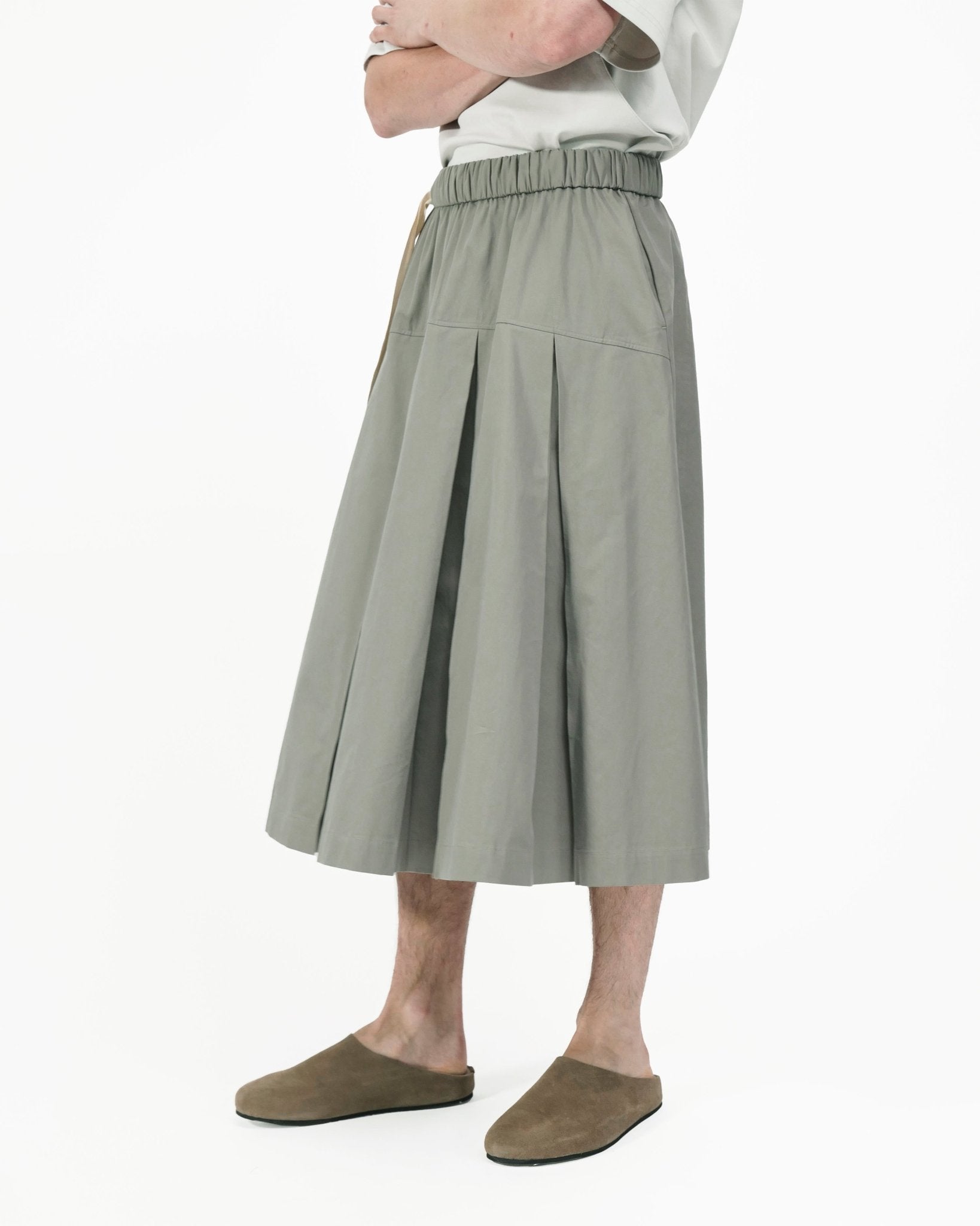 Face one shows crisp box pleats that open into an easy, flared silhouette with swing and presence. Rotate it and the focus shifts to calm topstitch lines for a cleaner read. The double-layered waistband encases a wide twill tape that emerges seamlessly at the side— meant to be seen, it adds character while letting you fine tune the fit.
