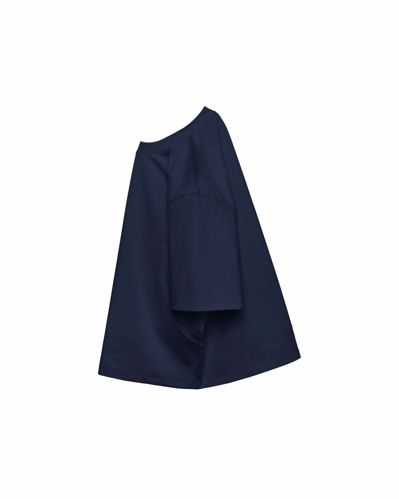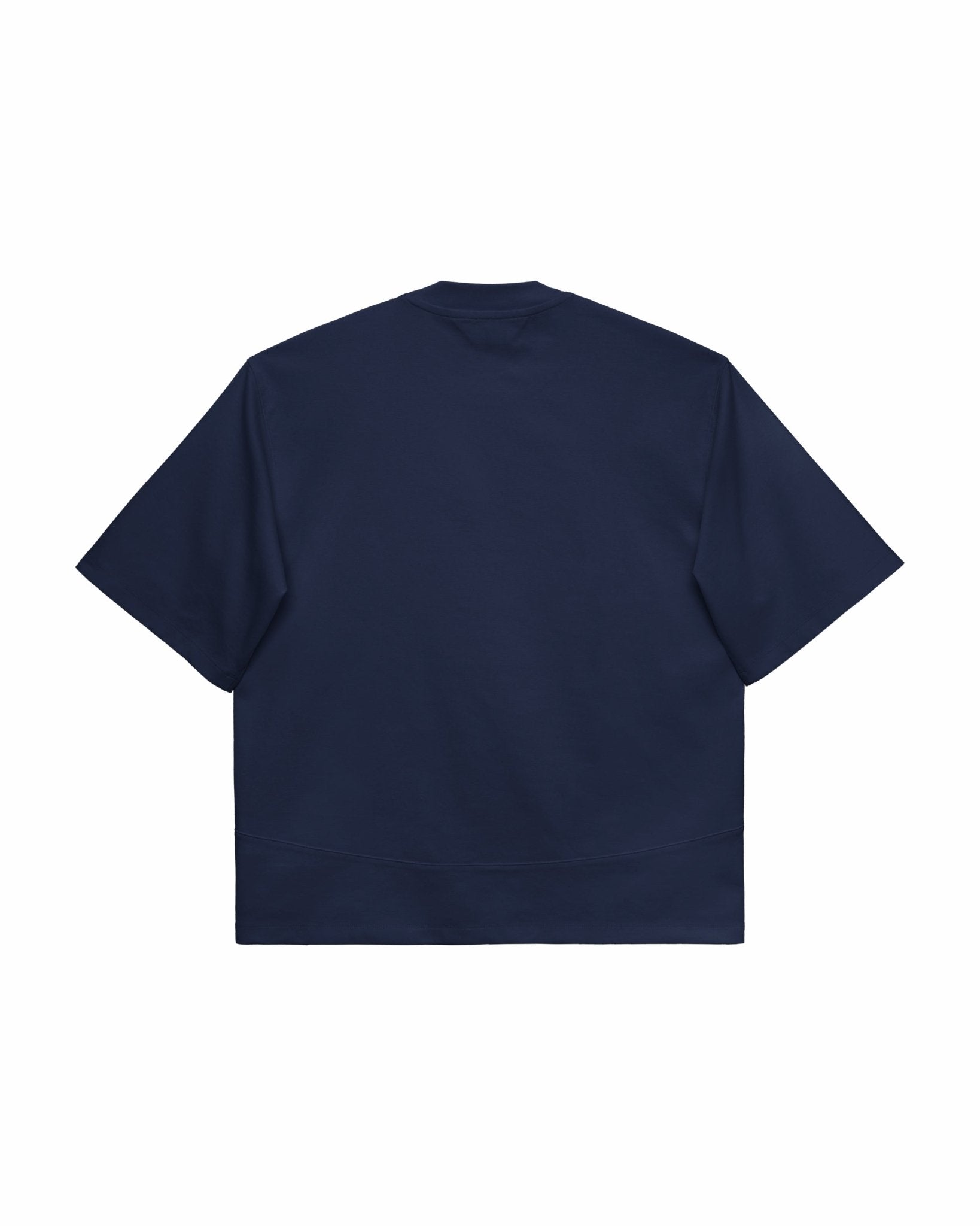 Crafted from a soft double-faced cotton blend, this tee drapes effortlessly on the body. Featuring two symmetrical curved seams that transition into practical waist pockets, it seamlessly combines design and functionality. Finished with fine topstitching and a round crew neckline, this versatile piece is a stylish addition to any wardrobe.
