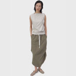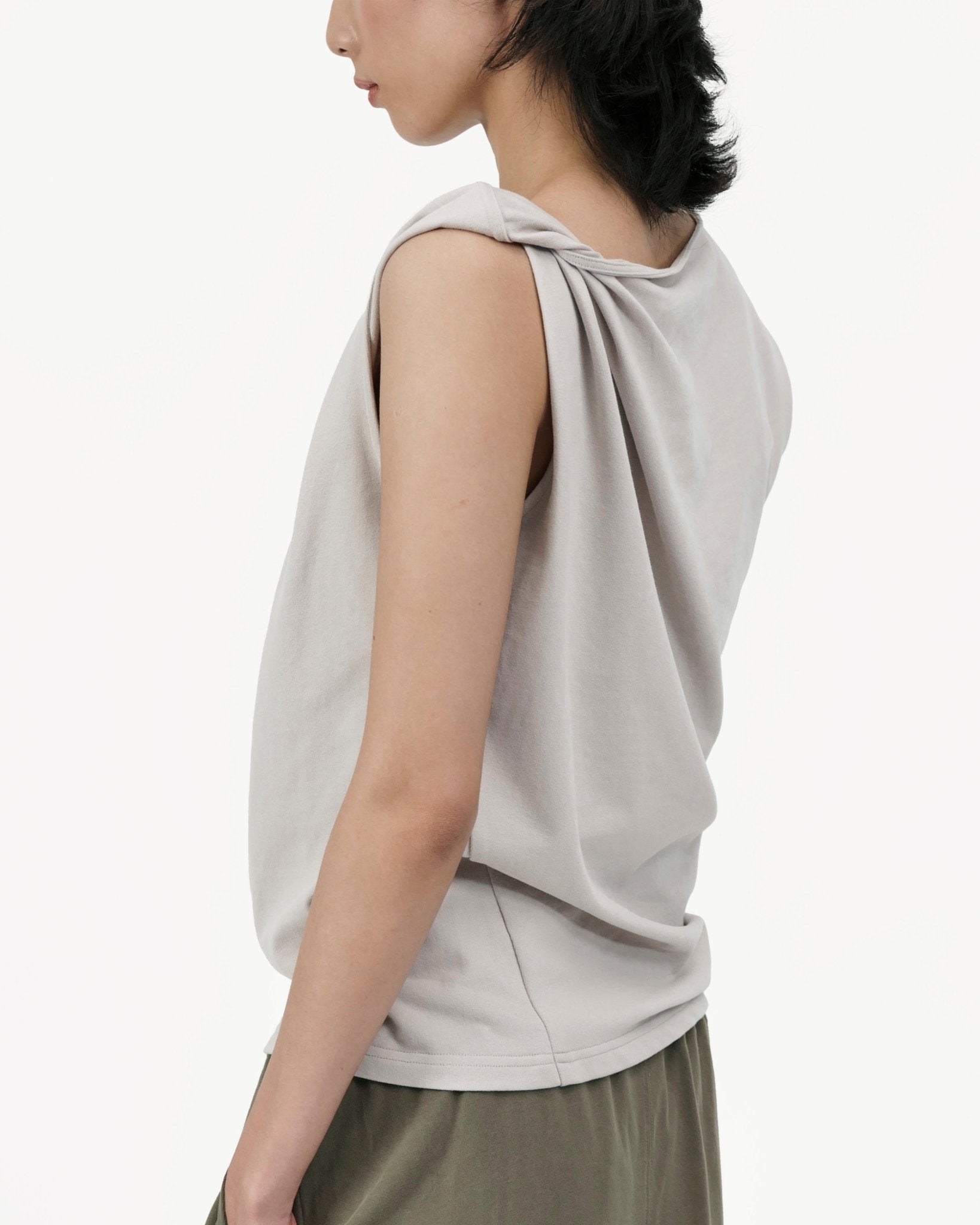 Cut from GOTS certified organic cotton jersey, it feels velvety on the skin and breathes easily on warm days. Soft folds and a single shoulder tuck create an asymmetric line that contrasts the smooth body. The hem sits neat to frame the drape, keeping the look sharp yet relaxed.