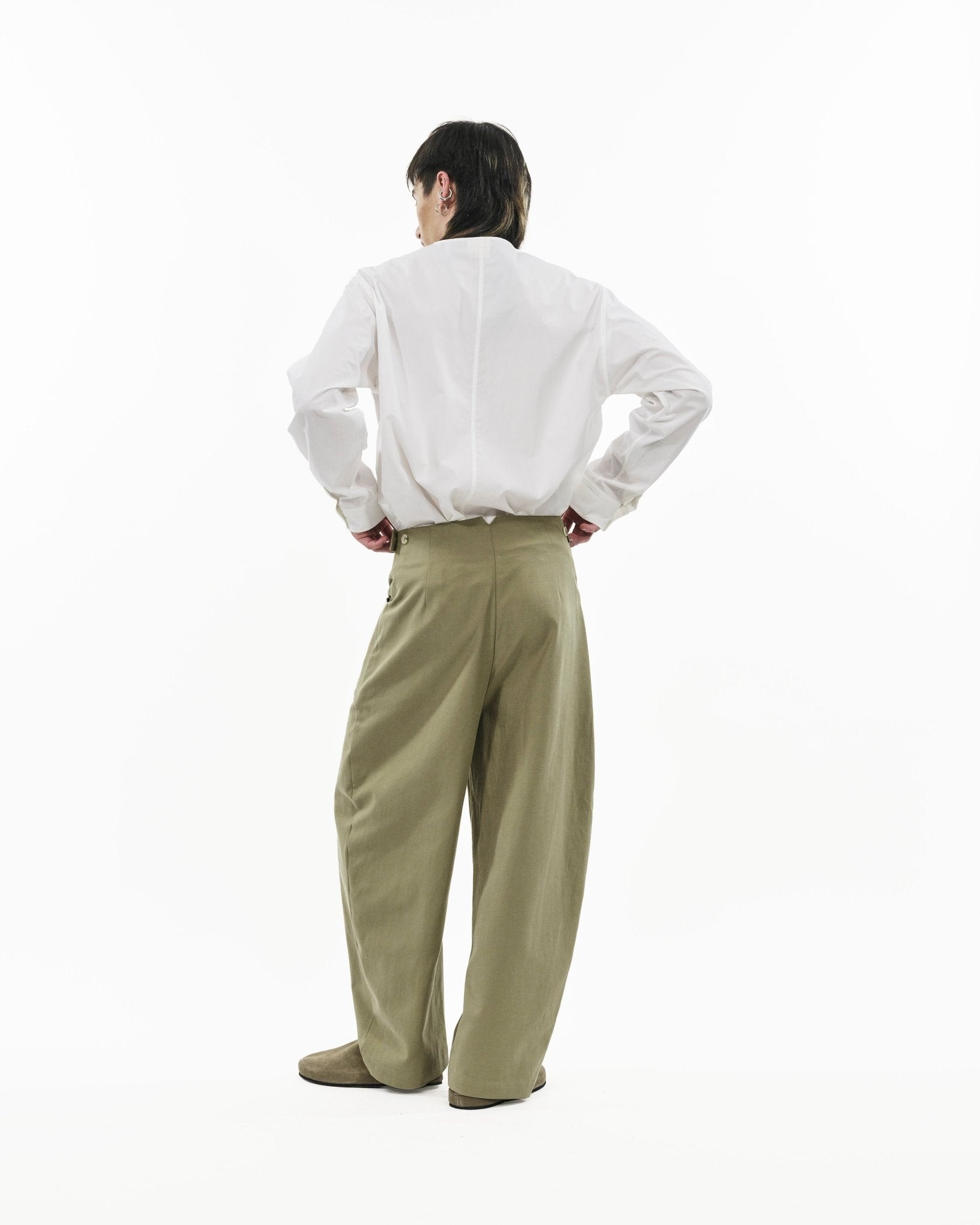 Cut in a full-length barrel silhouette, these high-waisted trousers are designed to elongate the leg while keeping the volume controlled and clean. The Gurkha-style waistband secures with double strap fastenings—giving you a tailored, adjustable fit without needing a belt.