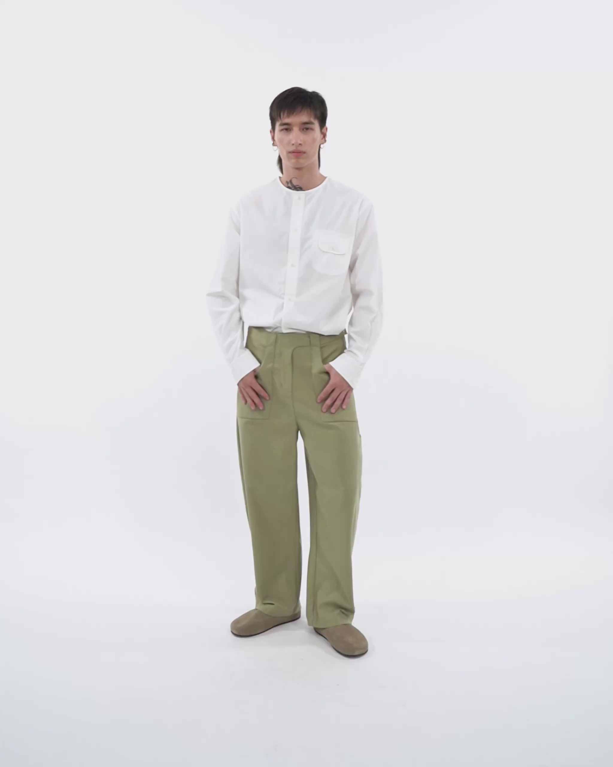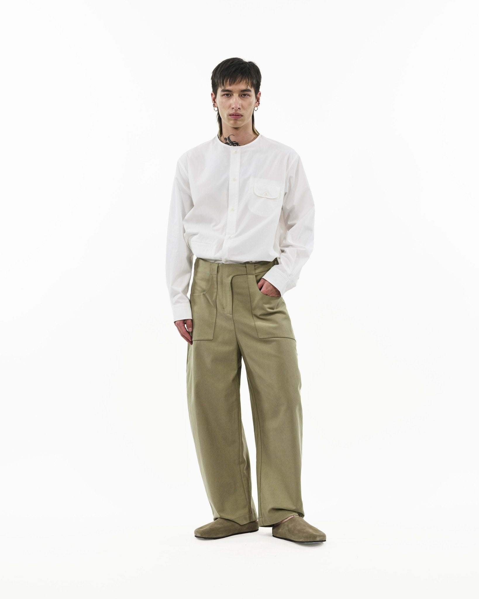 Made in a soft cotton–tencel twill(56% cotton, 44% tencel), the fabric drapes with fluidity but holds enough structure to stay sharp through the day. A polished staple that nods to vintage utility, refined for modern ease.
