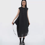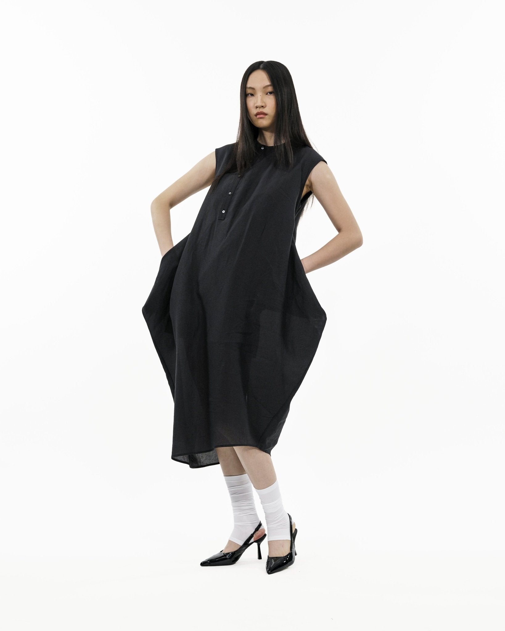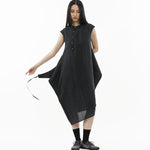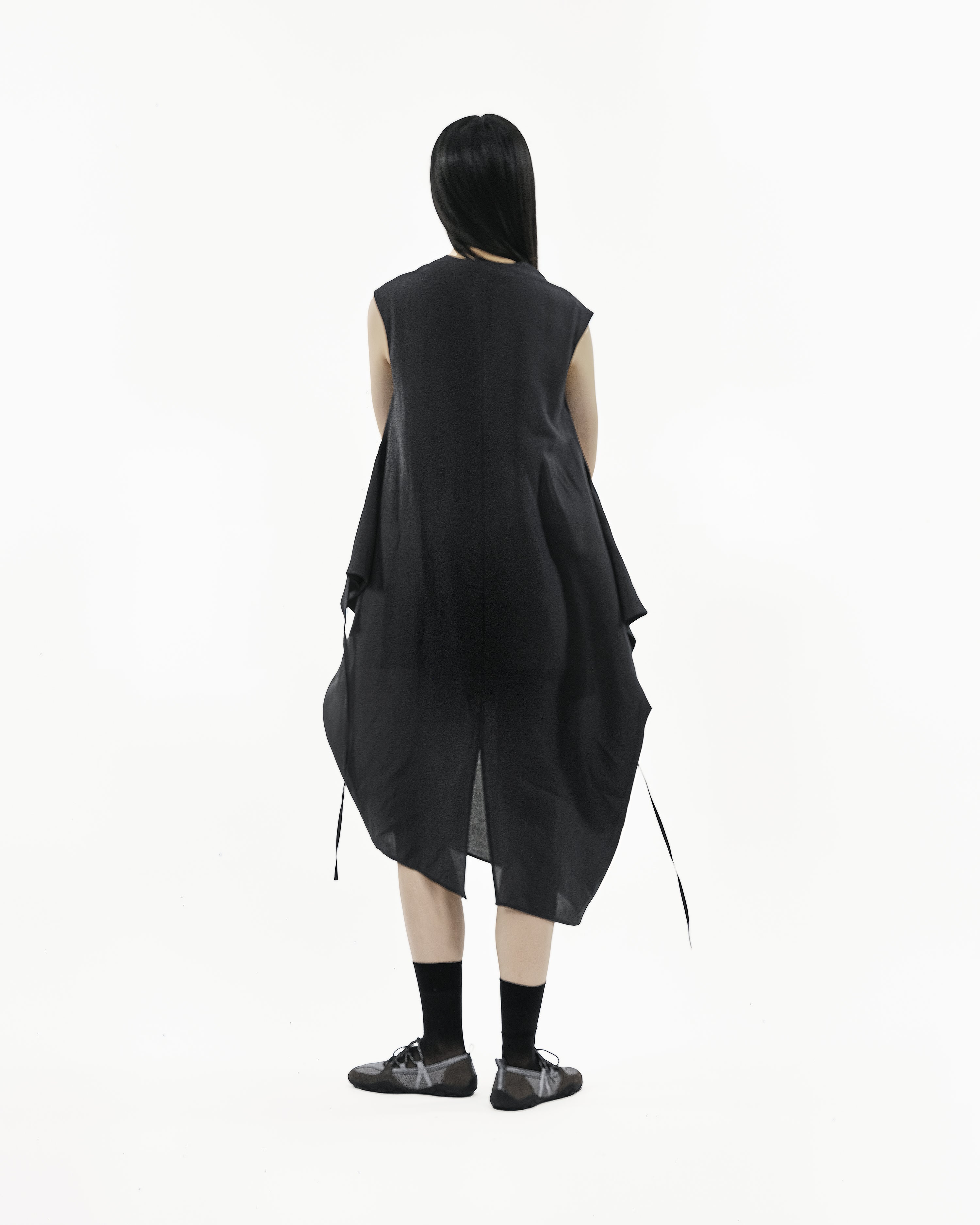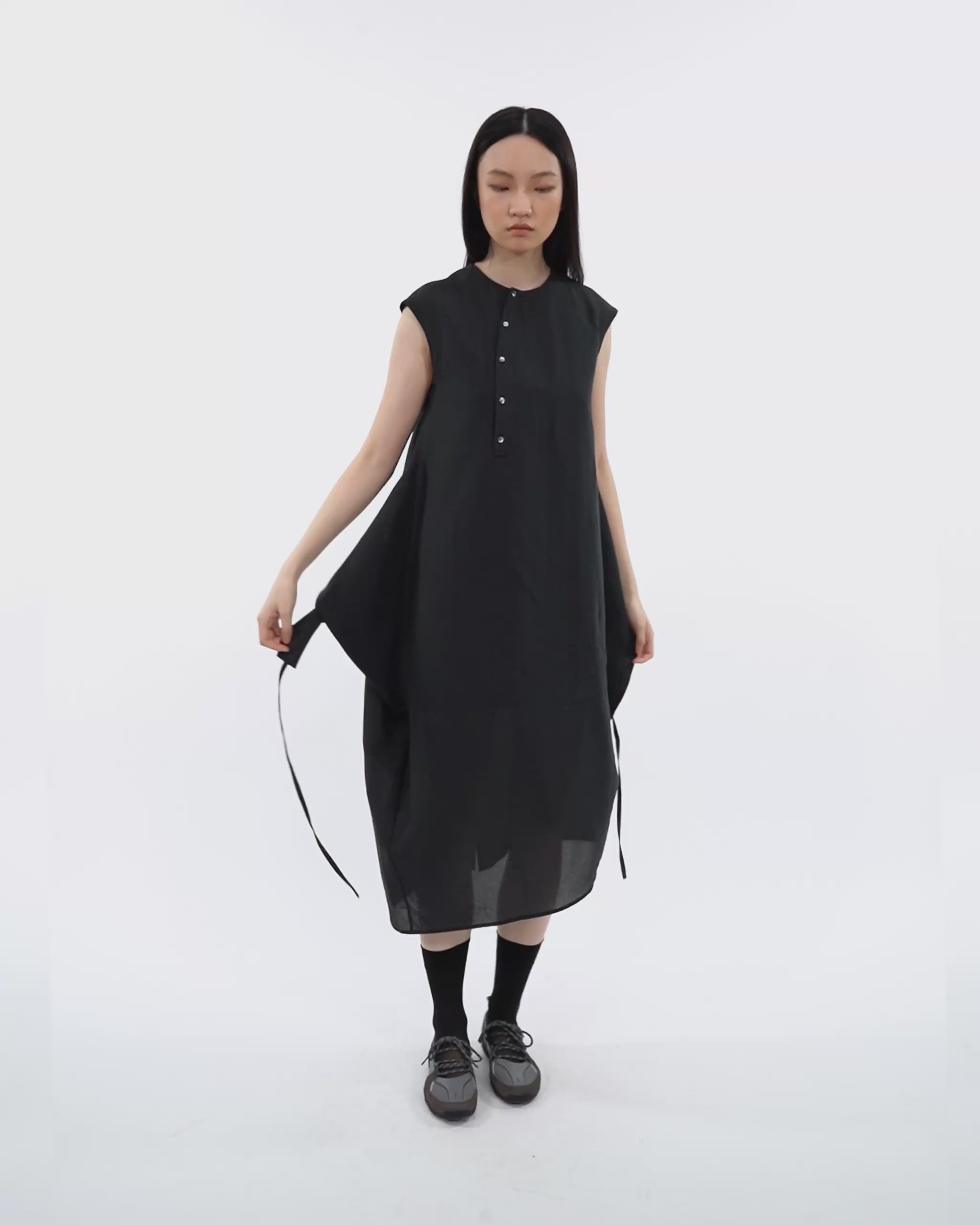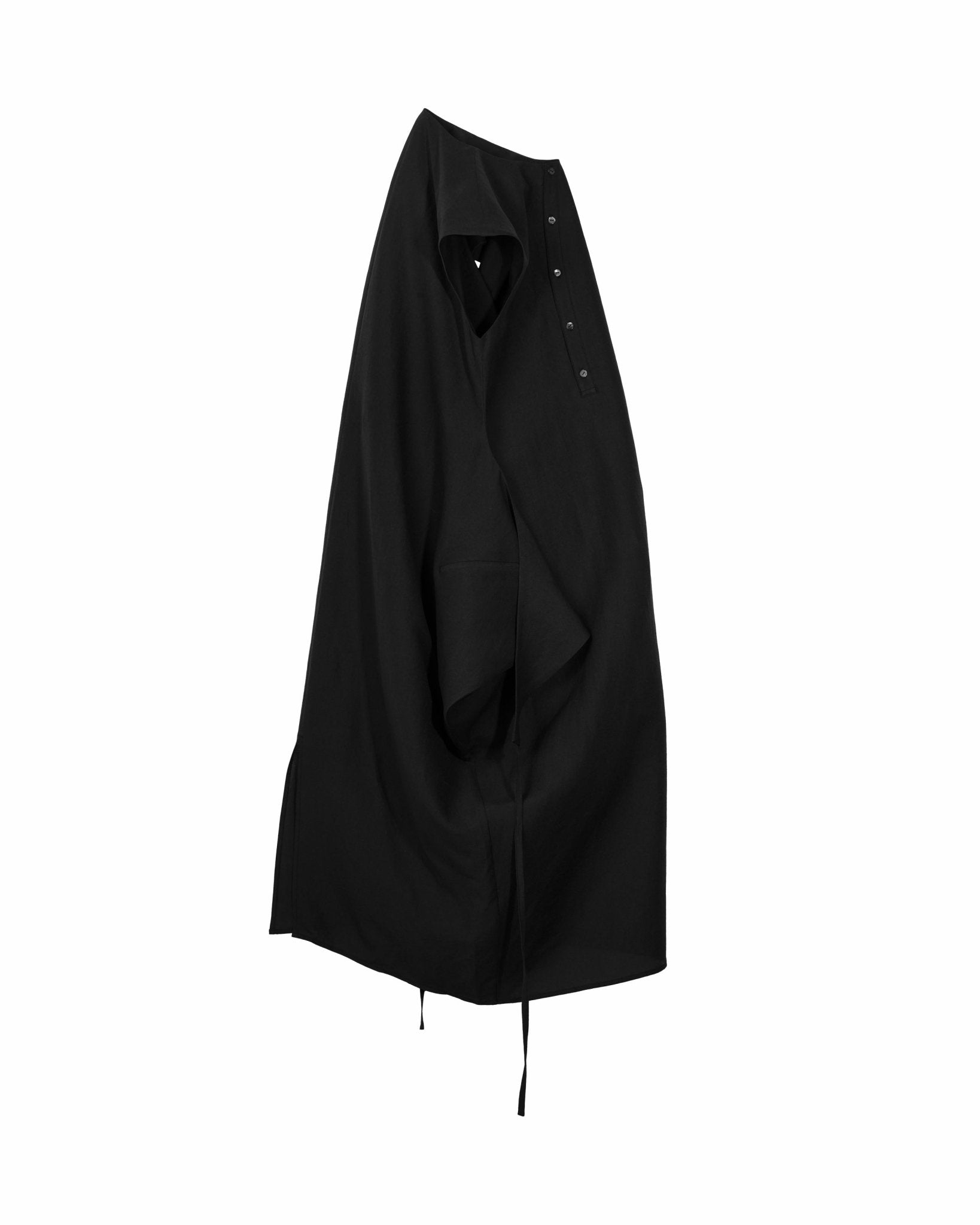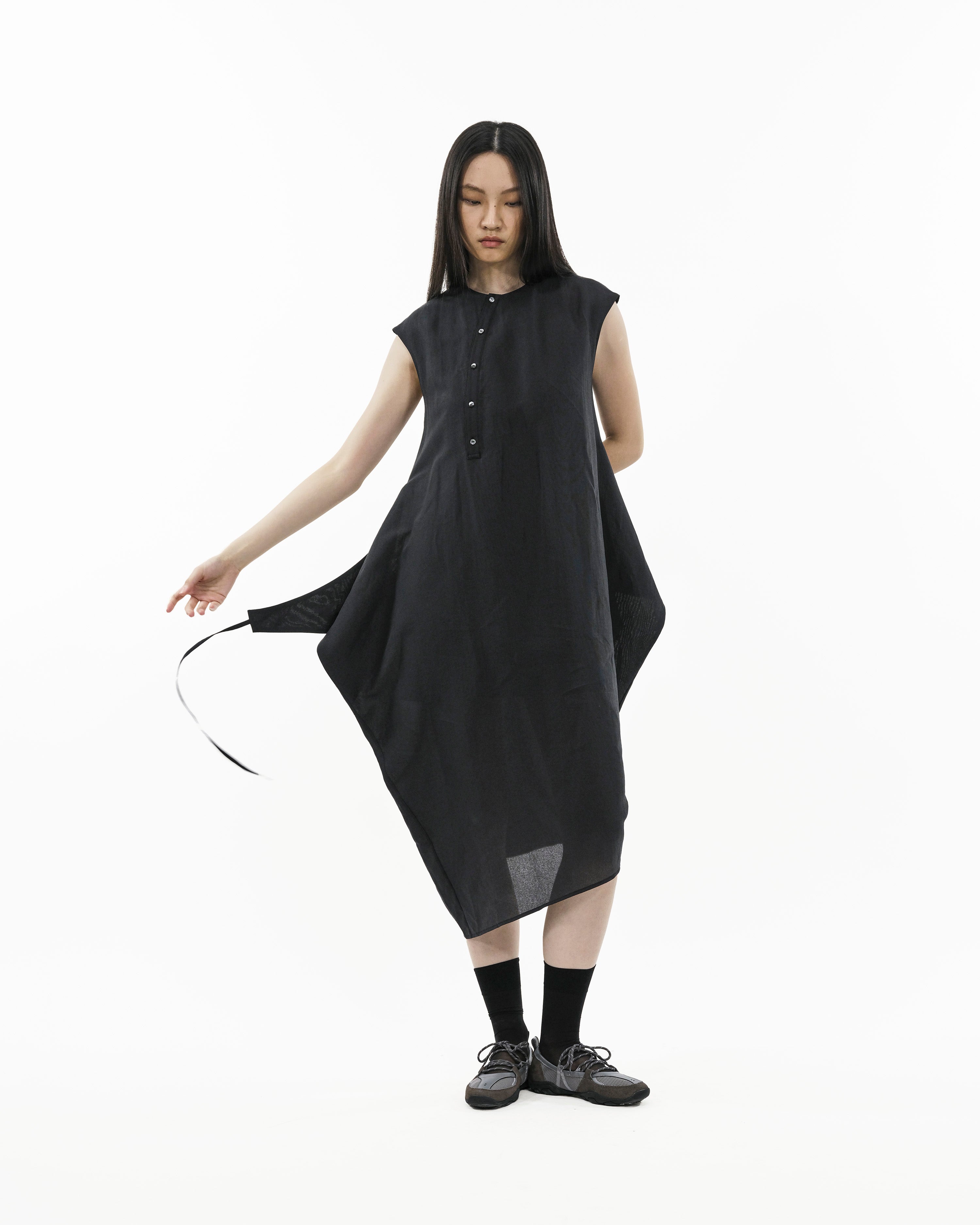 Cut in a cap-sleeve cocoon silhouette, it’s built to transform. Extended side panels finish with drawstrings on both sides: wear it loose and relaxed, criss-cross into a wrapped form, or reverse-tuck the panels to create functional pockets. Finished with an asymmetrical button placket, a high-low hem, and a modest back slit for ease of movement.