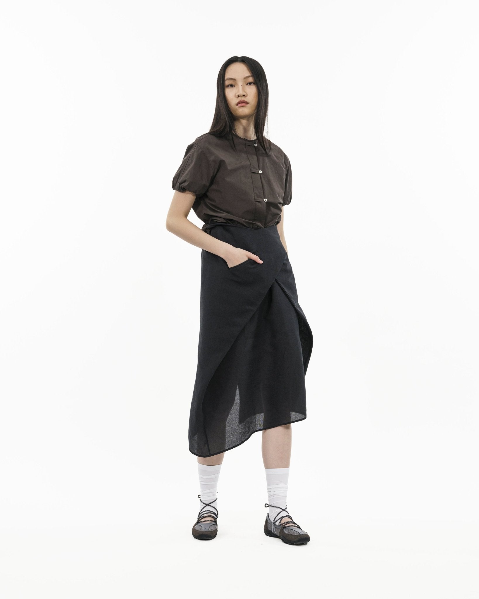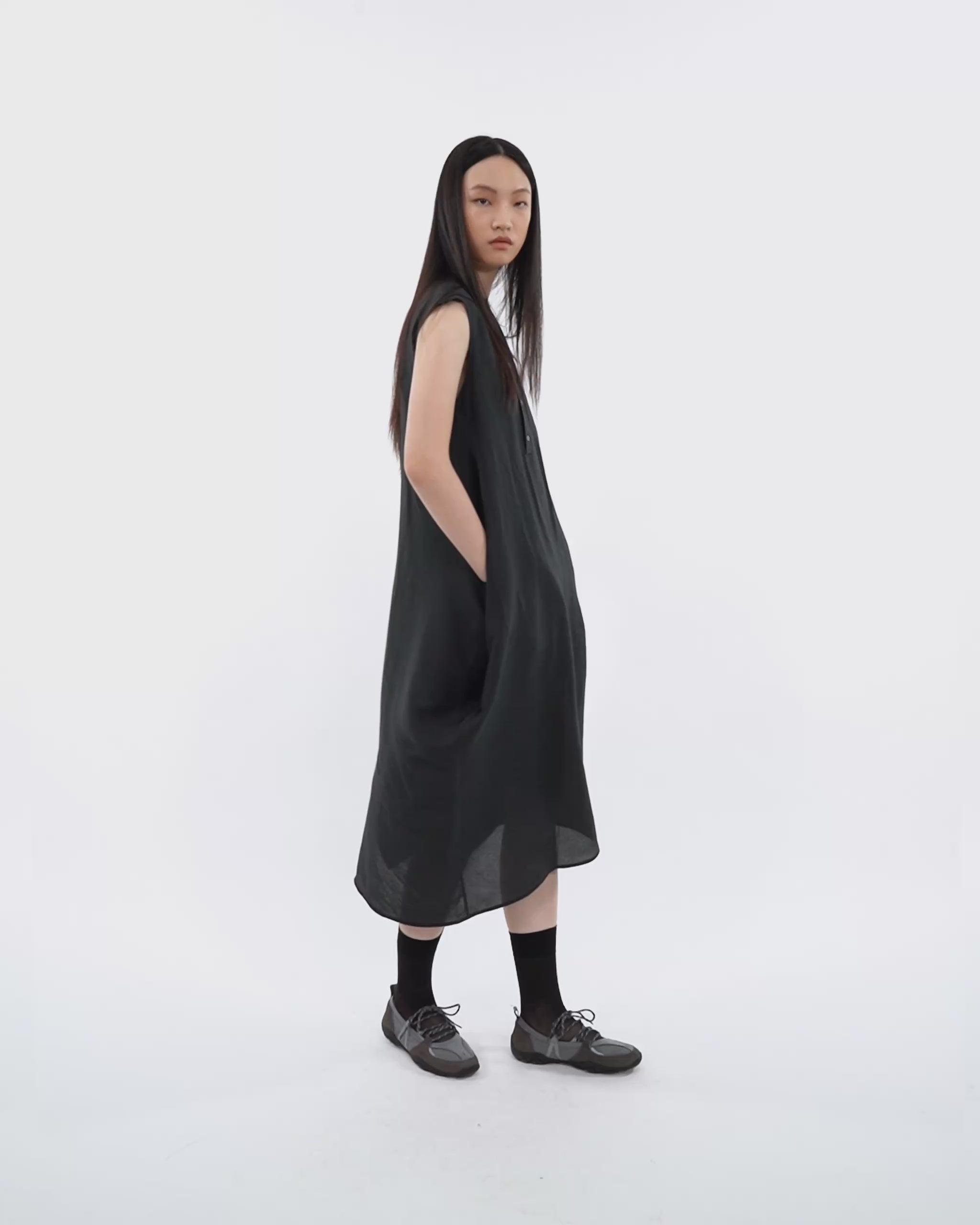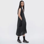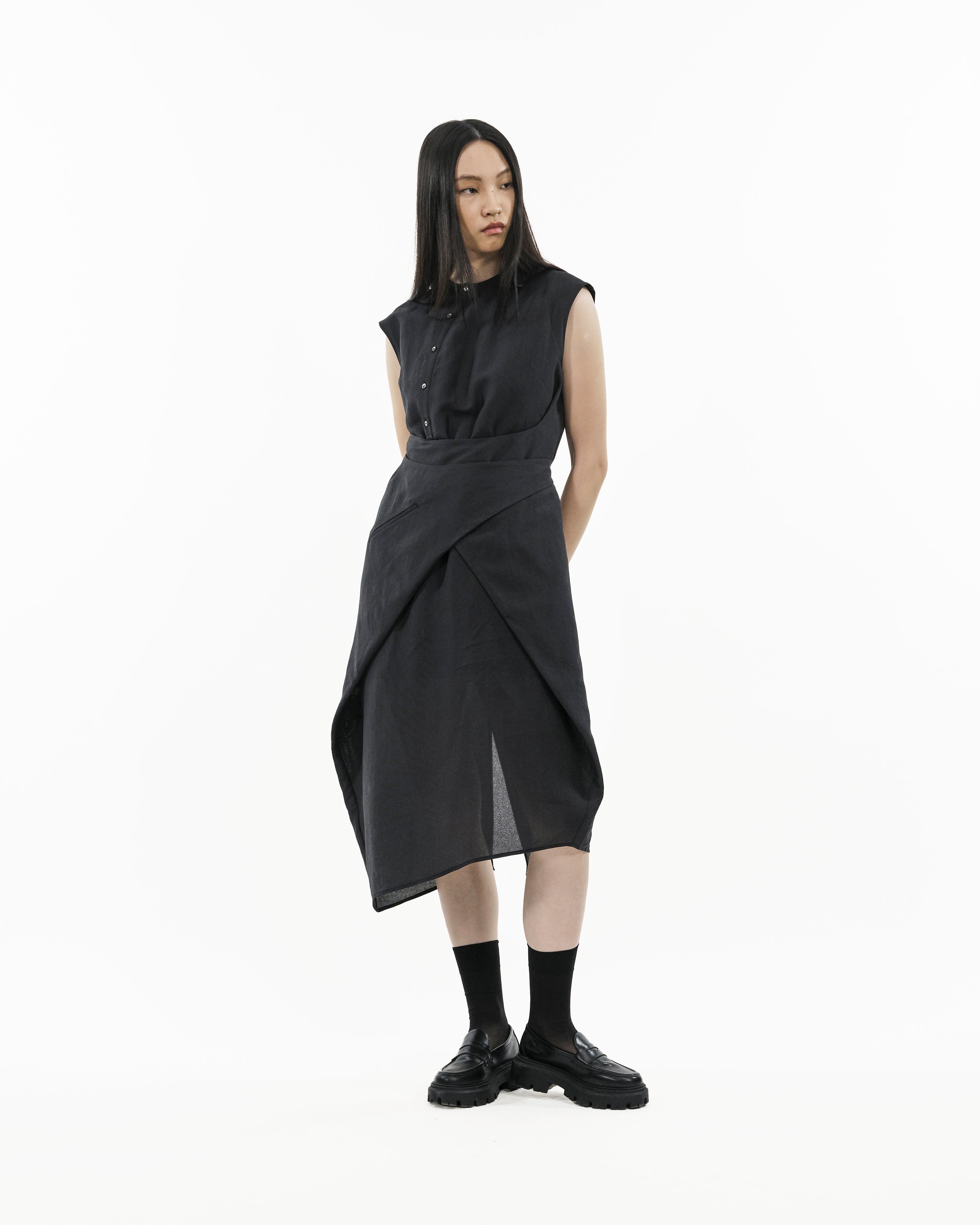 We wanted a warm-weather dress that feels dry and airy on the body. The paper-yarn blend gives that crisp lightness, while the recycled polyester and nylon add strength for repeat wear. The side panels are the point—wrap them, criss-cross them, or reverse-tuck into pockets to change the shape without changing the piece.