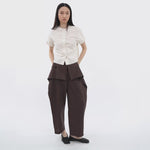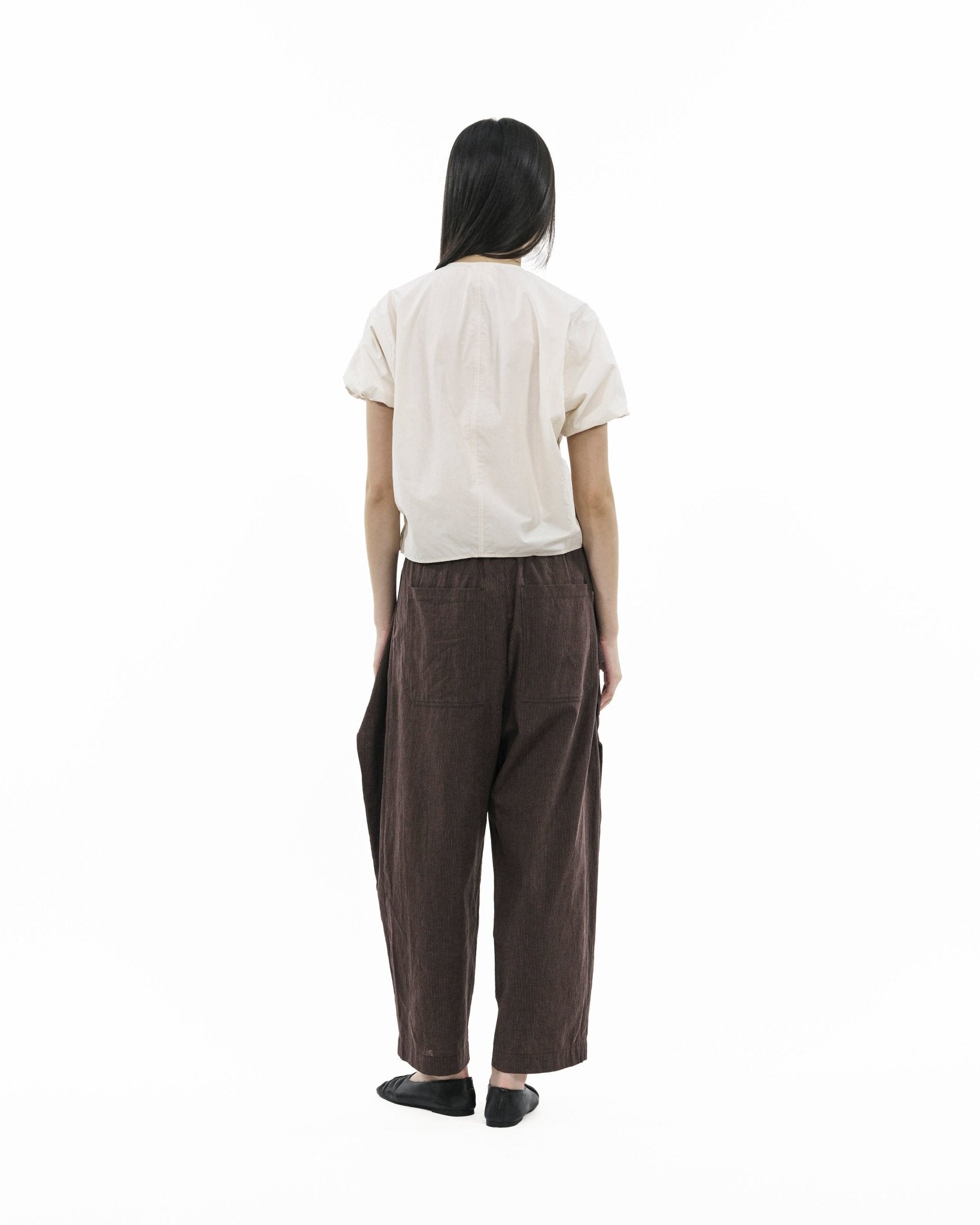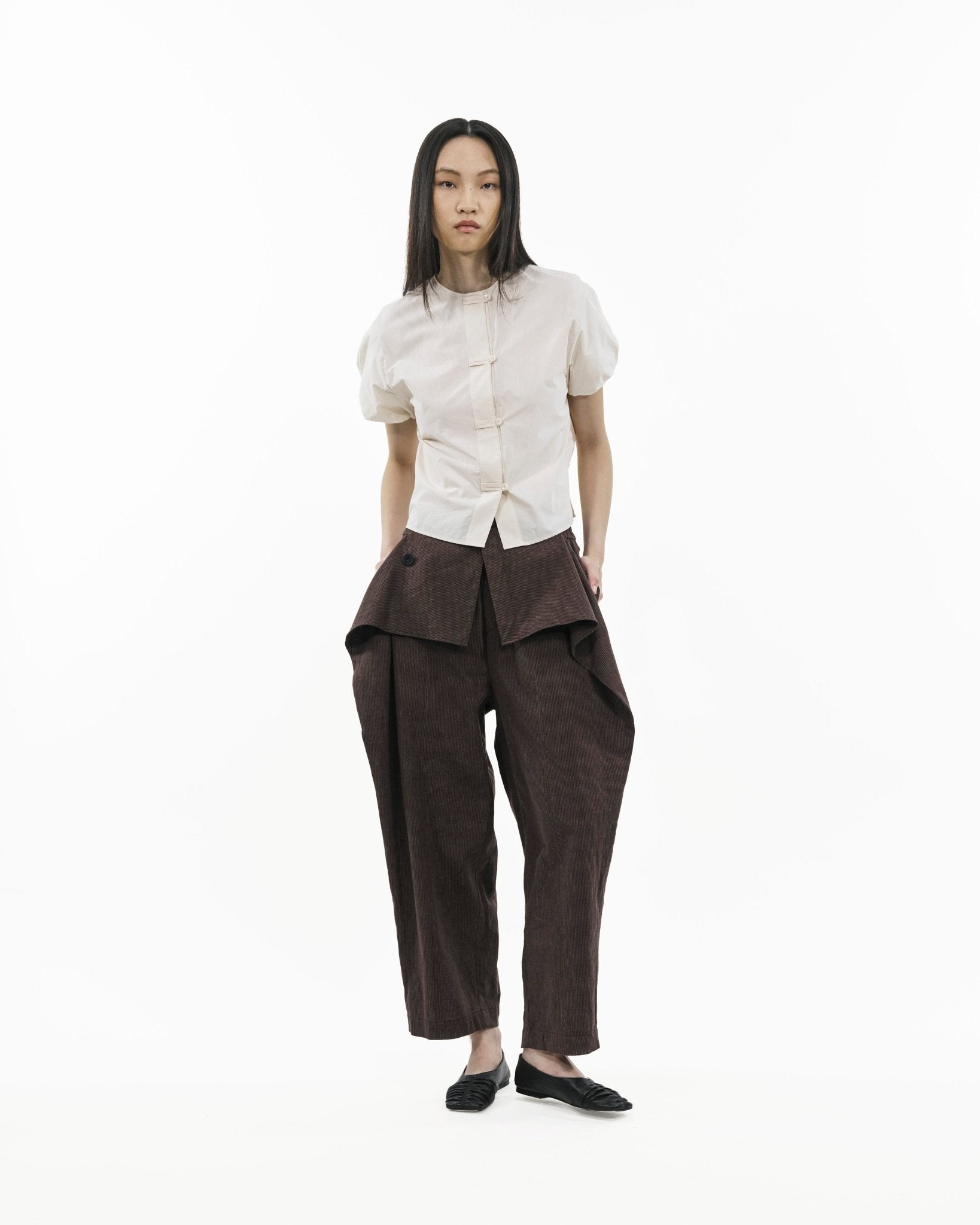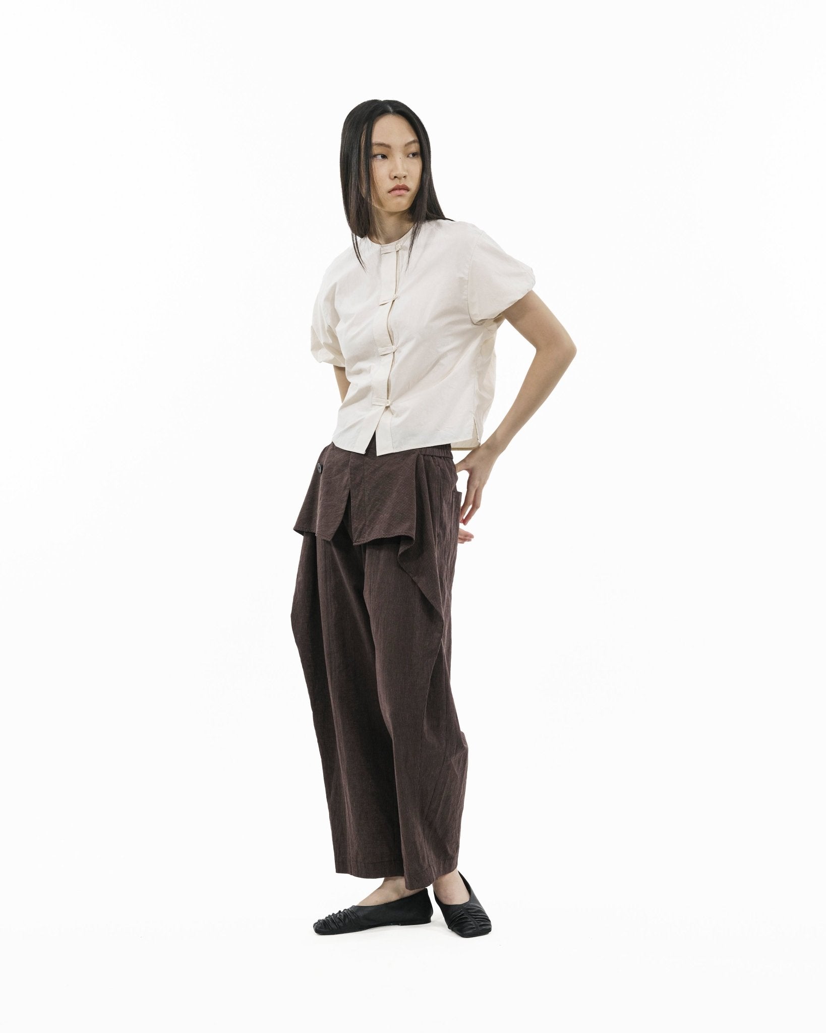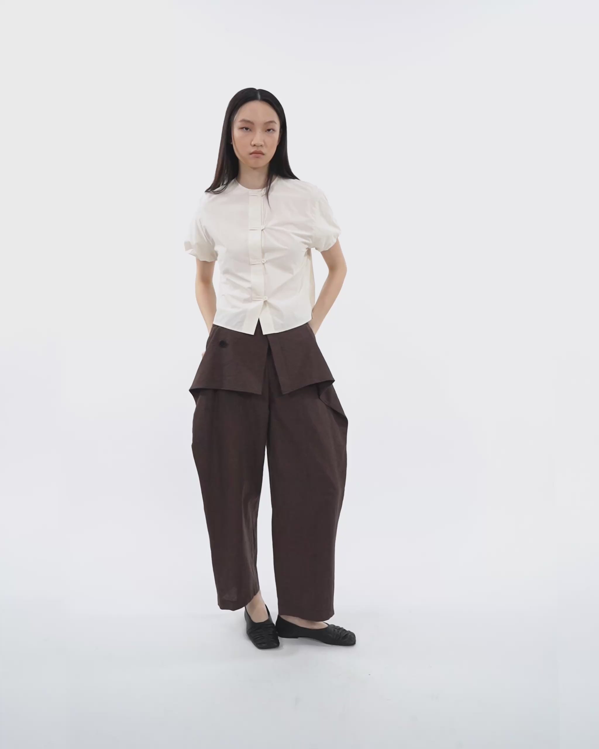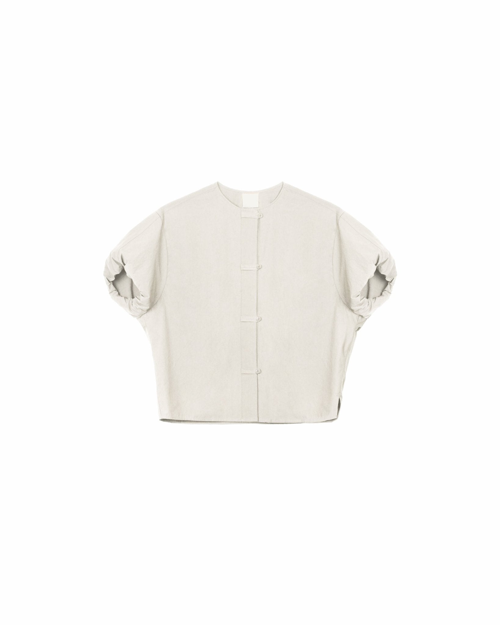 Cut in a sculptural cocoon silhouette, the blouse balances volume with control through elasticated bubble sleeves and a gently tapered hem. Down the centre, Chinese-inspired cord loops add an oriental nuance—reinterpreted with durable corozo buttons for a cleaner, more functional finish. Grounded in texture and proportion, this piece brings depth to everyday wear.