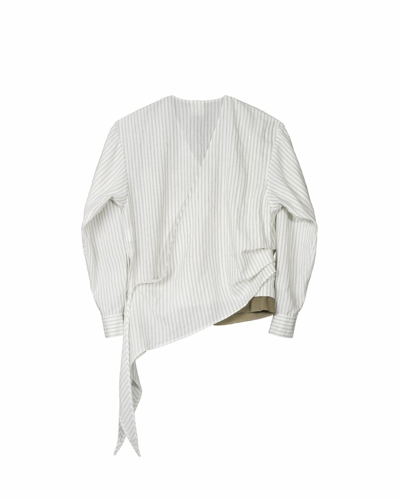 We wanted a shirt that feels like layering, but stays light. The long wrap panels let you change the proportion—buttoned for an easy drape, or tied for a more defined waist. The stripe placement does the rest: it creates movement even when you’re standing still, and the frayed hem keeps it from feeling too “proper.”
