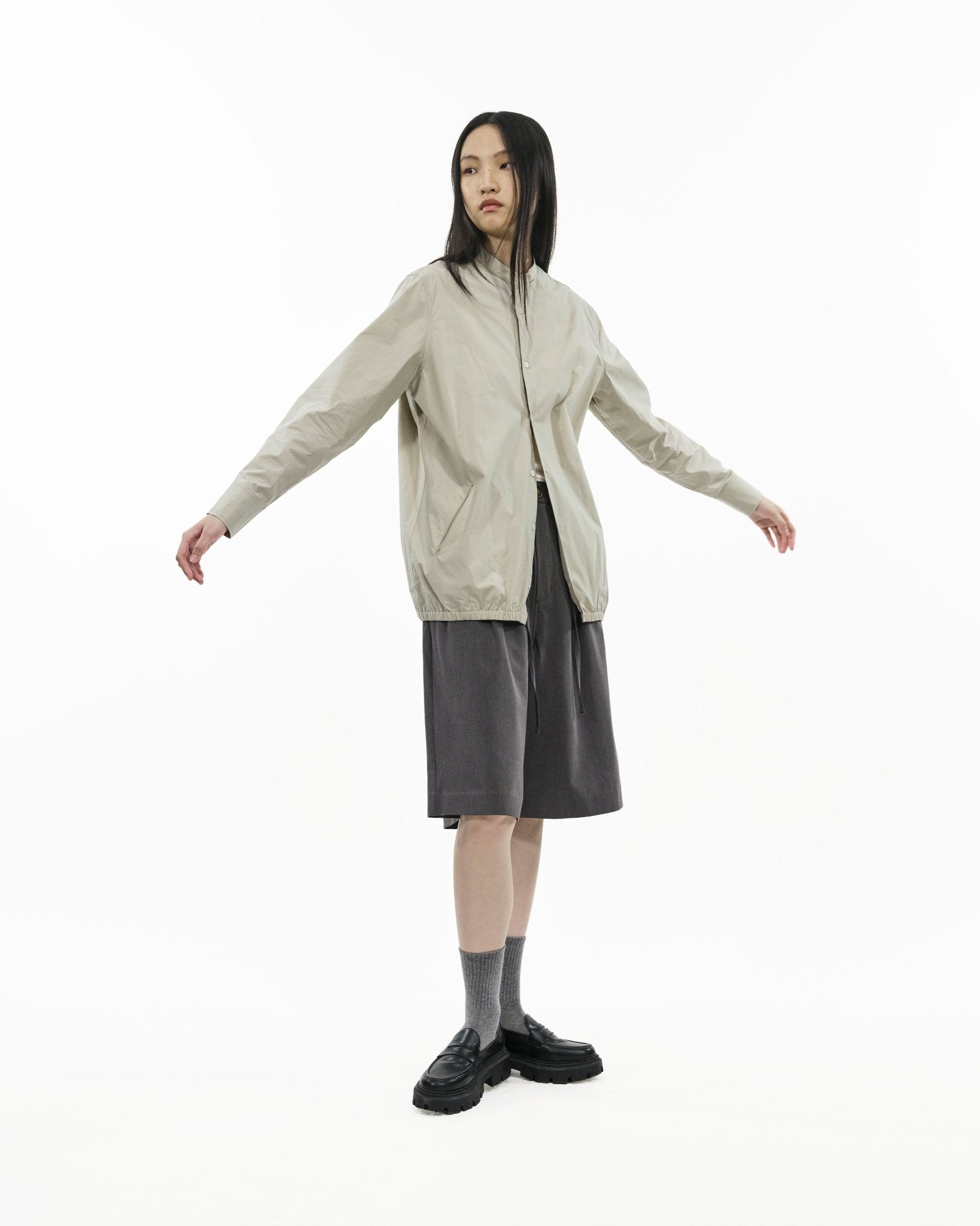 Finished with weltless side pockets and soft gathers at the yoke for quiet volume, then anchored by an elasticated hem for a controlled shape. Wear it buttoned as a long shirt, or layer it open as a lightweight outer layer for a more relaxed, jacket-like feel.