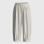 Cut with a generous fit through the hips and thighs, it drapes effortlessly—anchored by an elasticated waistband and soft pleats that introduce subtle definition while enhancing fluidity. A tapered hem refines the silhouette, with a hidden adjustable drawstring allowing you to shape it to your preference—loose for a relaxed, organic flow or cinched for a more sculpted profile.