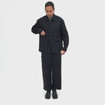 Workwear redefined with a luxe touch. A sleek, boxy silhouette with stacked pockets and snap closure paired with the midnight blue cotton-nylon-spandex that offers durability and comfort.